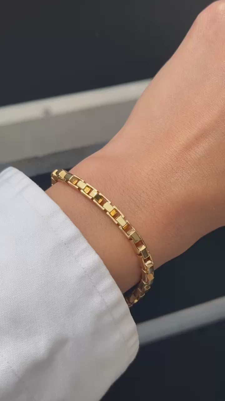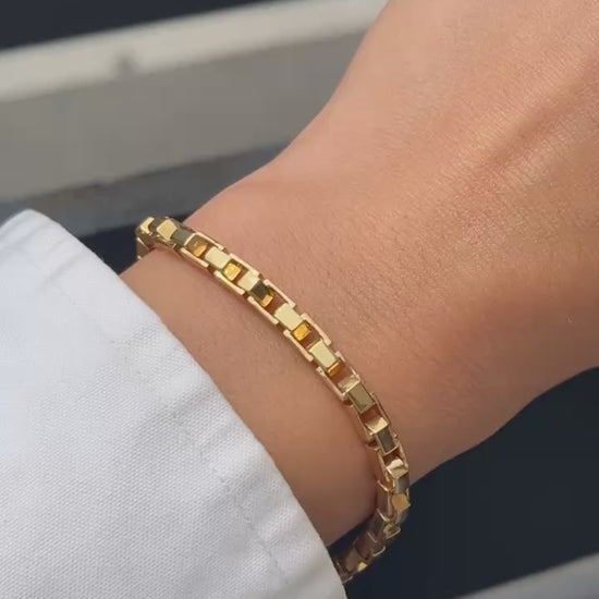 A 3.5mm wide custom-made box chain inspired bracelet in 18k solid yellow gold. This unique bracelet is created using our LÖF signature handcrafted rectangle and hexagon links creating a unique box chain silhouette.